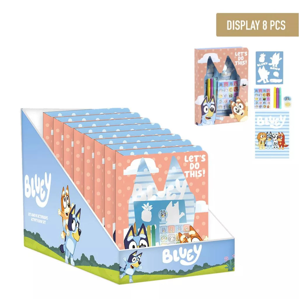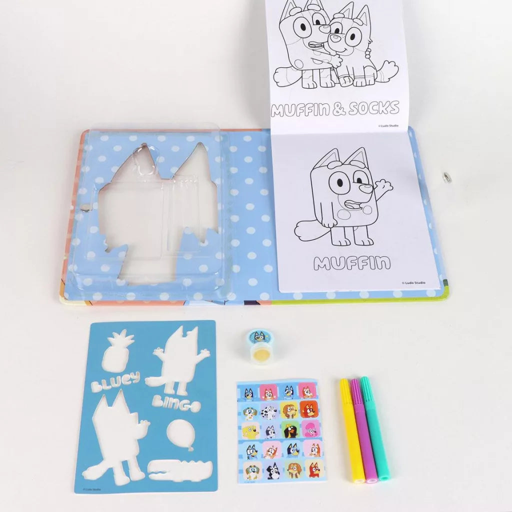 Inclui materiais de desenho e atividades criativas (3 marcadores, 1 stencil, 1 carimbo, autocolantes, livro colorir Bluey)