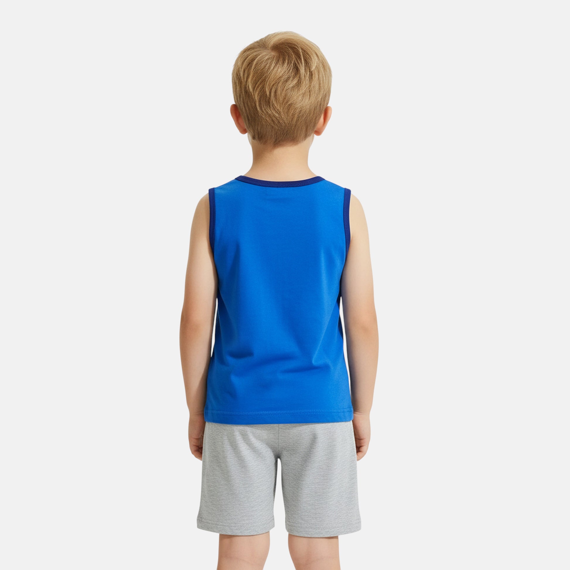 Ideal para dias de verão, brincadeiras ou momentos de lazer, combina uma t-shirt leve sem mangas e uns calções frescos, garantindo liberdade de movimentos e máximo conforto.